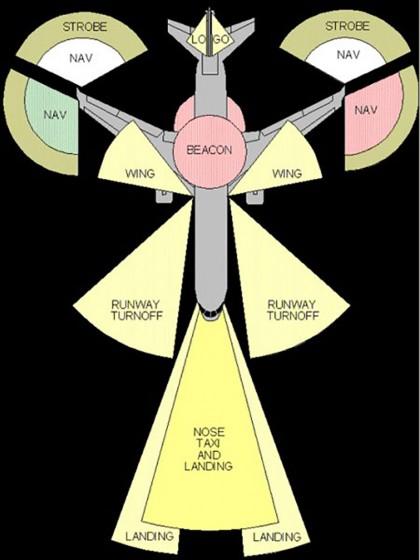 ไฟ Landing Light จะติดตั้งอยู่ที่ด้านข้างลำตัว บริเวณโคนปีกในตำแหน่งด้านล่าง ส่วนไฟ Nose Taxi light จะติดตั้งที่ฐานล้อหน้า